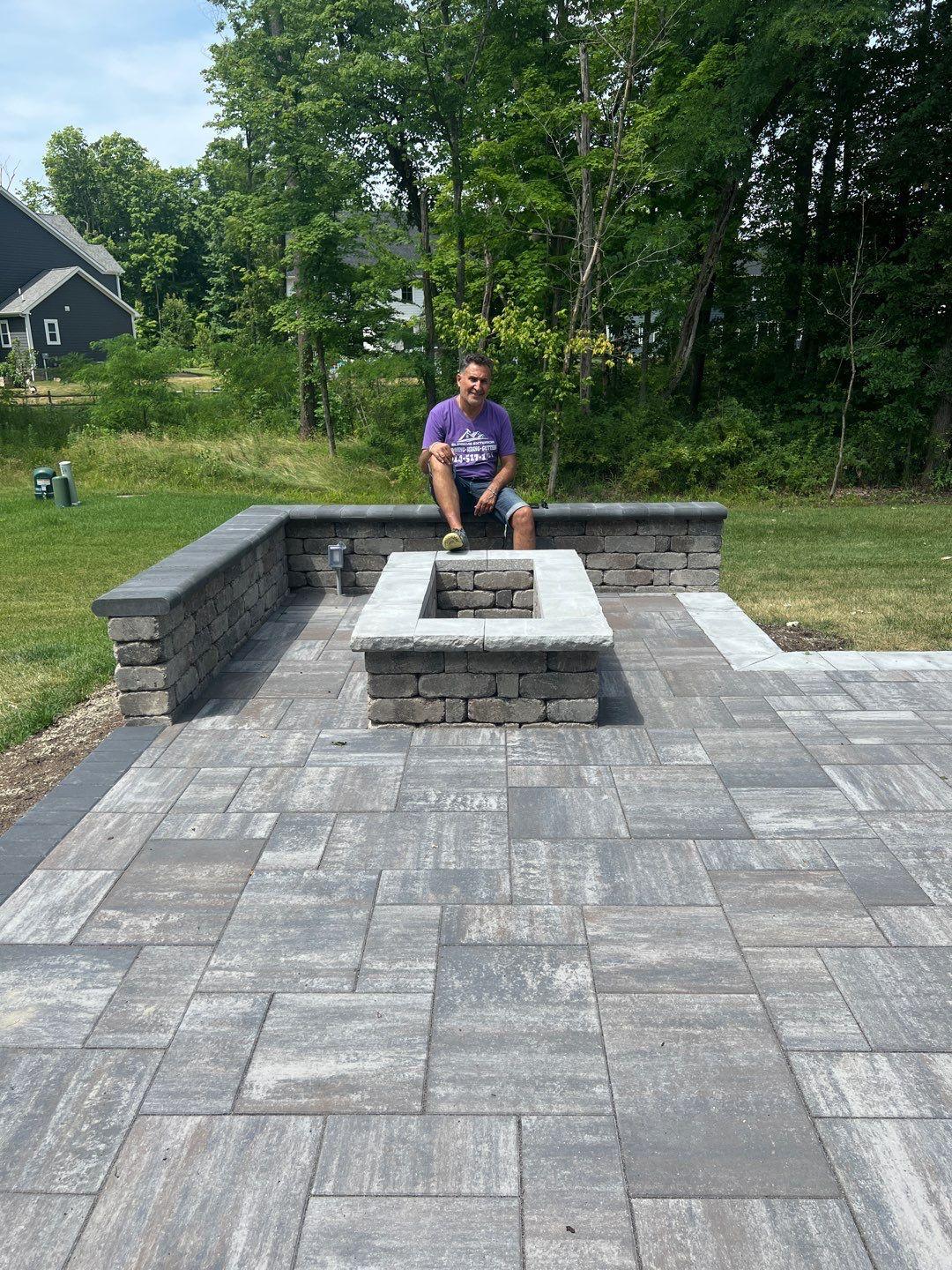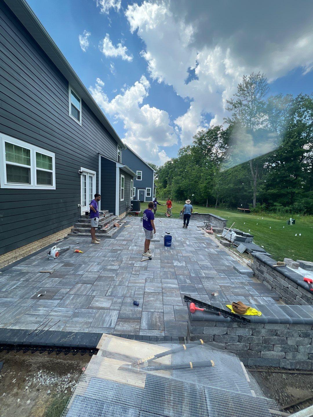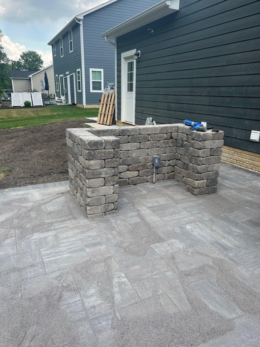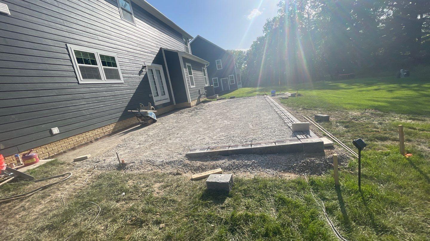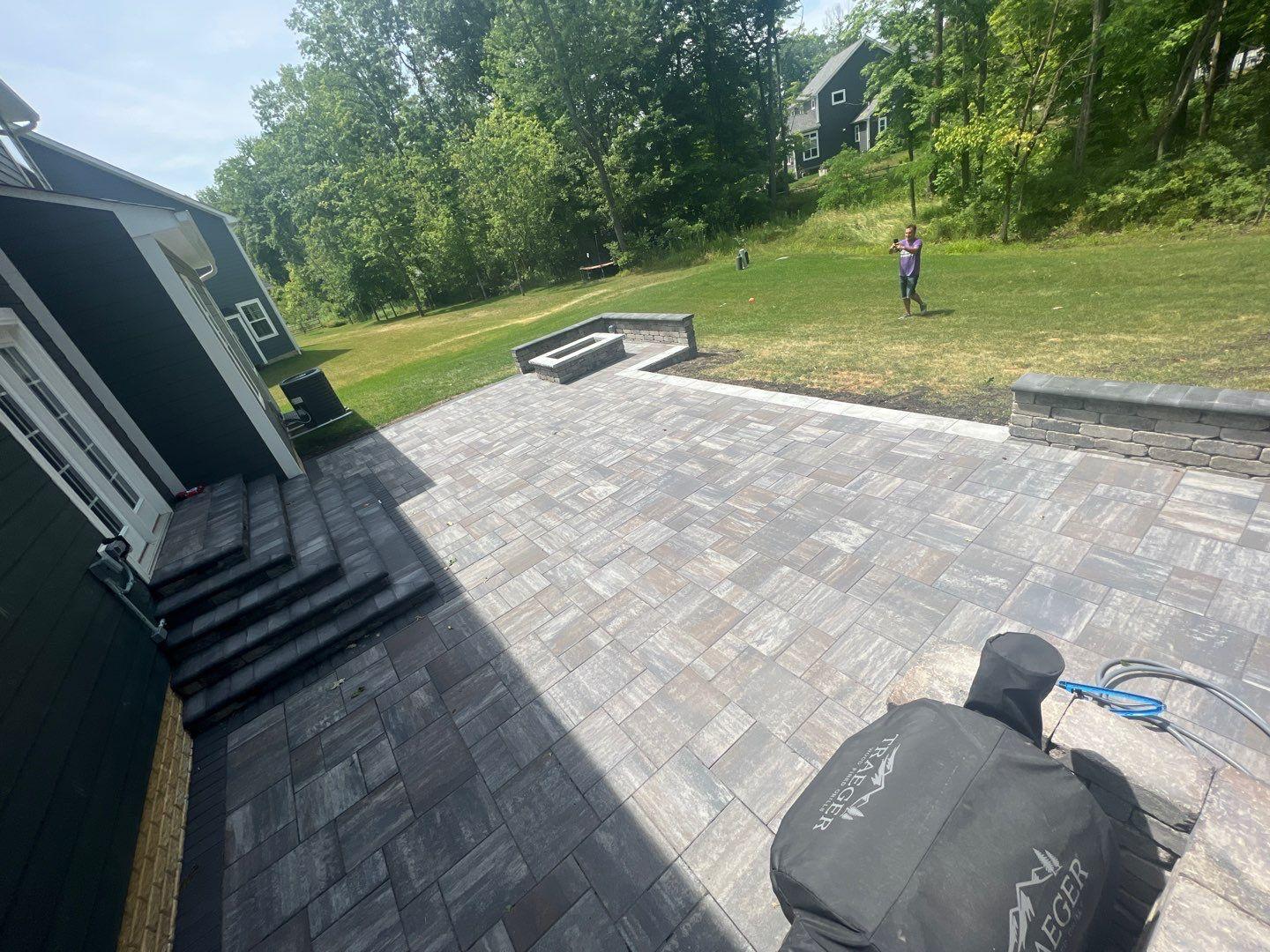 we began by clearing and grading the backyard (see the attached photos) so water would move away from the house. A compacted gravel base was installed to support the patio and help prevent settling or shifting over time, which is very important. After that, we set the pavers in a tight pattern with proper edge restraints. We also built matching seating walls and a grill surround to create a complete outdoor living area. The paver color blend was chosen to match the home’s siding and natural setting, so the patio looks like it always was there.