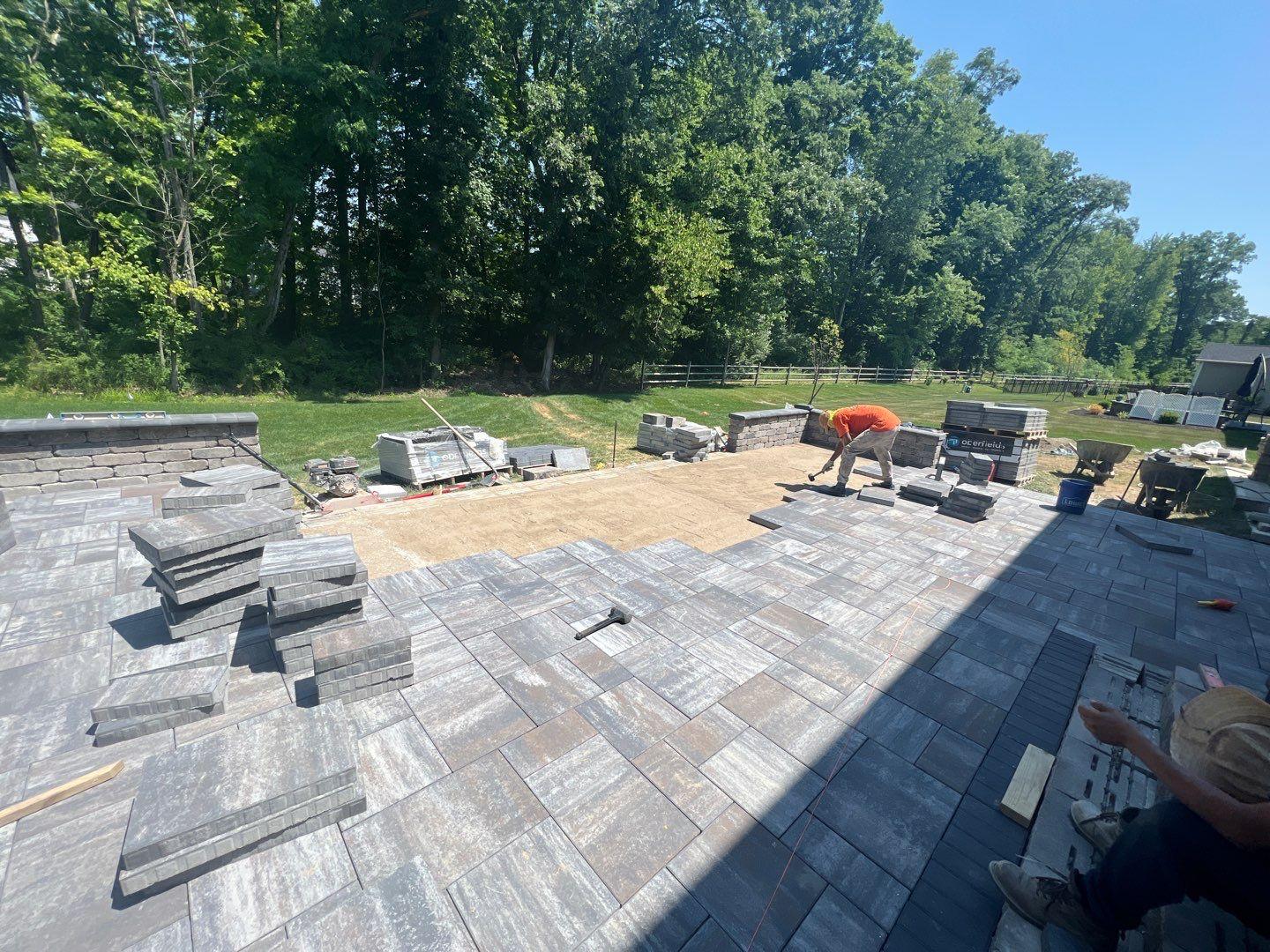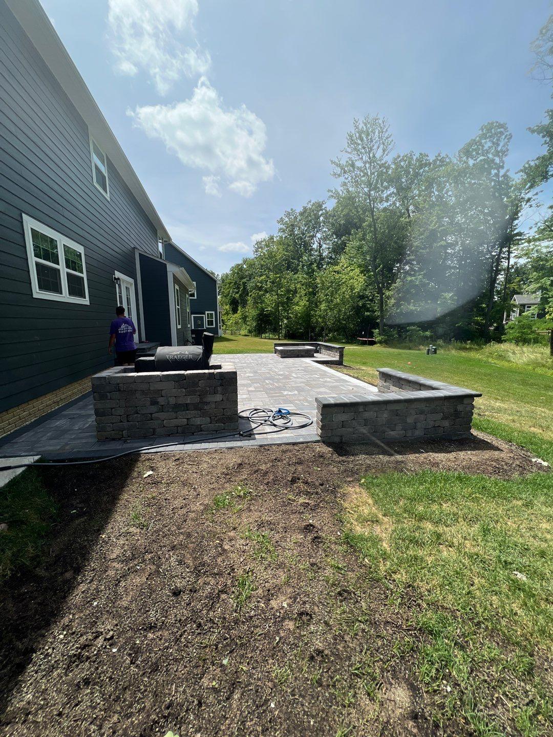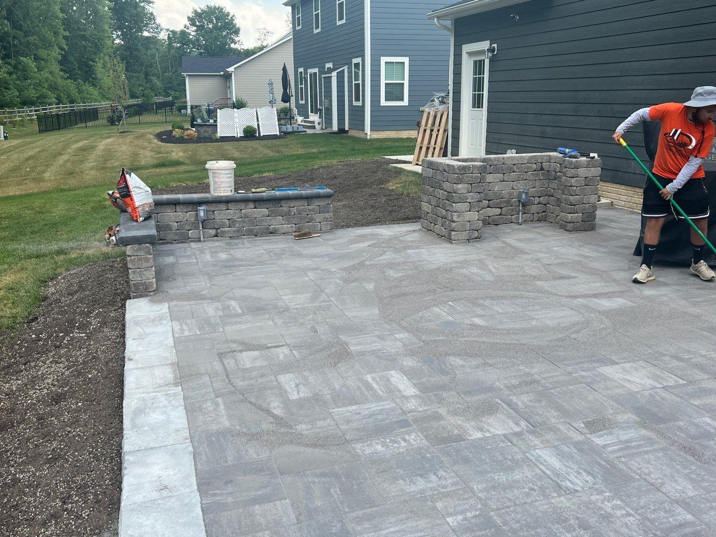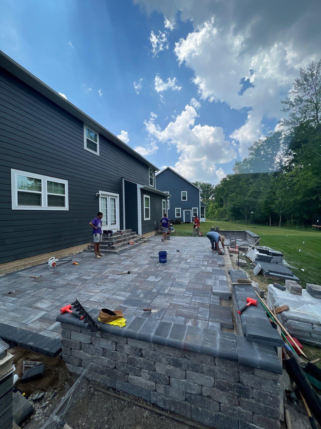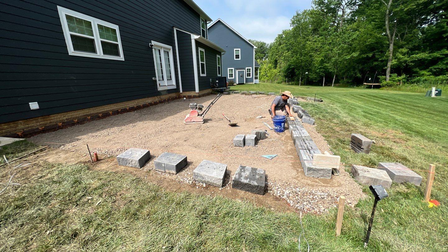 we began by clearing and grading the backyard (see the attached photos) so water would move away from the house. A compacted gravel base was installed to support the patio and help prevent settling or shifting over time, which is very important. After that, we set the pavers in a tight pattern with proper edge restraints. We also built matching seating walls and a grill surround to create a complete outdoor living area. The paver color blend was chosen to match the home’s siding and natural setting, so the patio looks like it always was there.