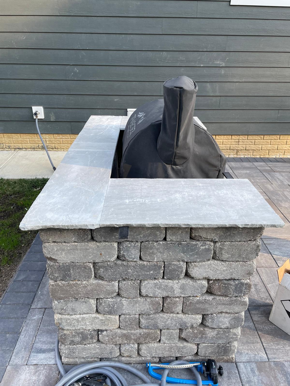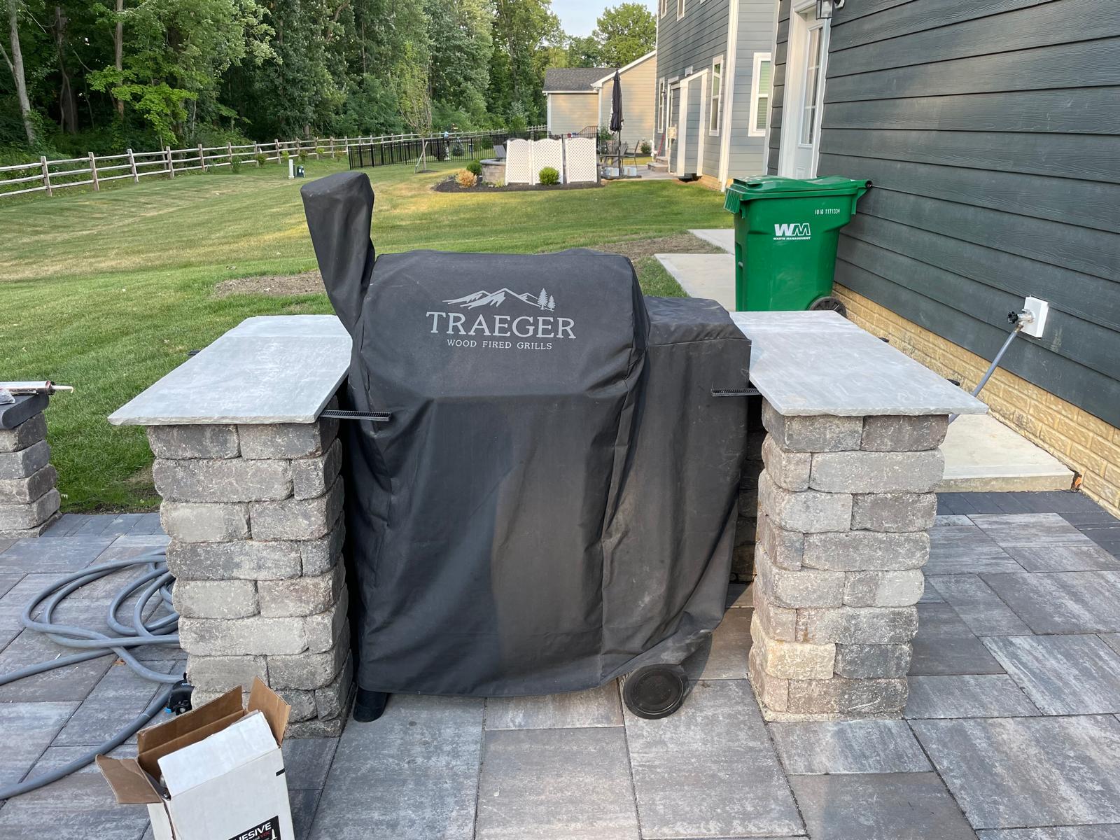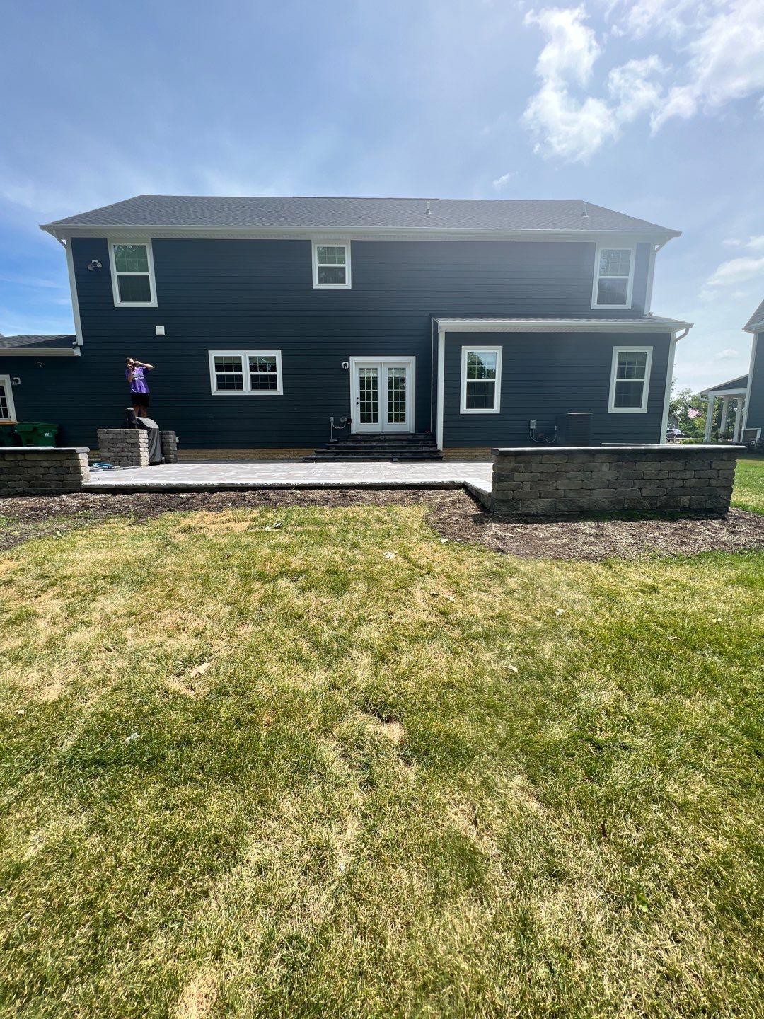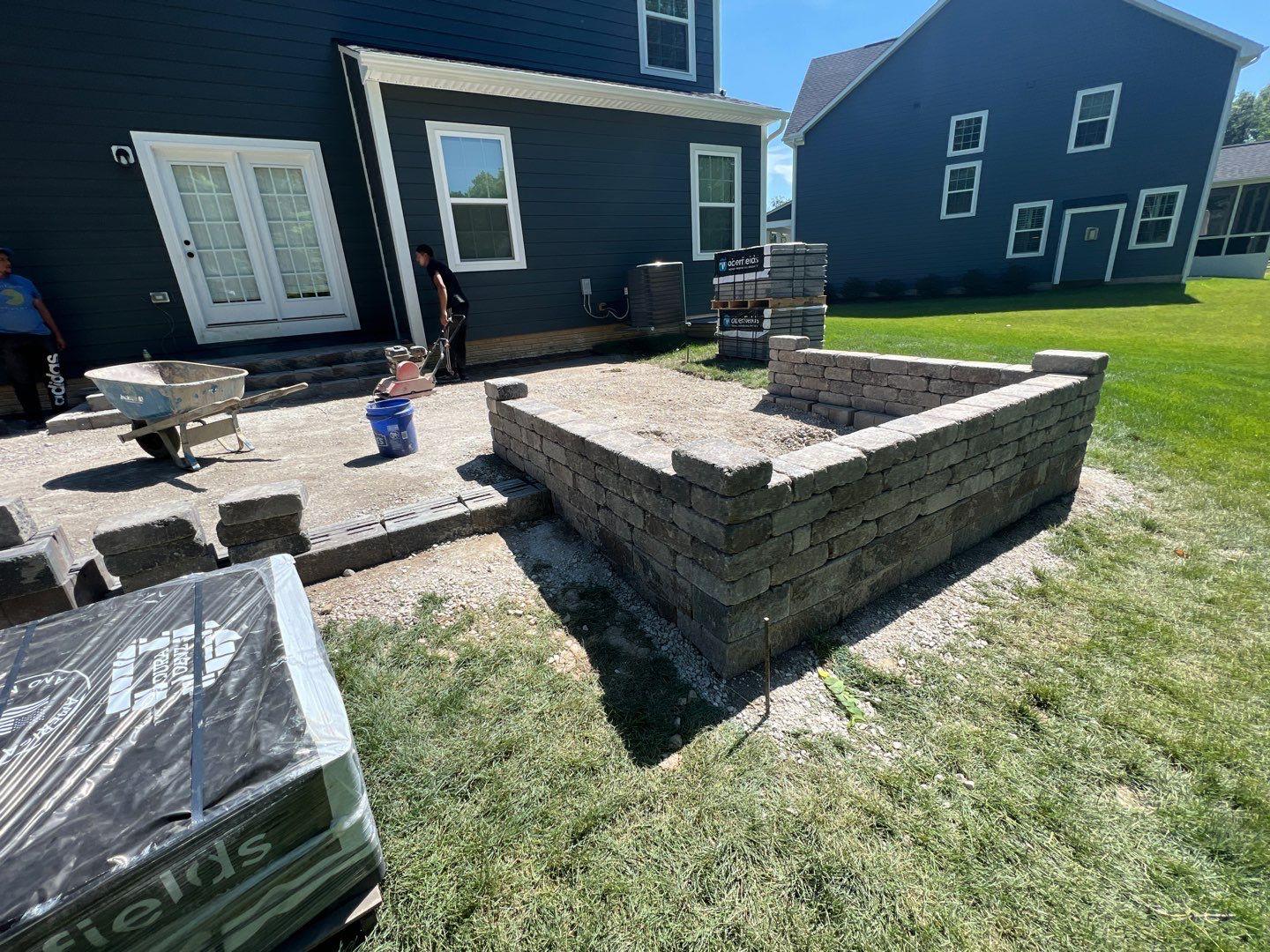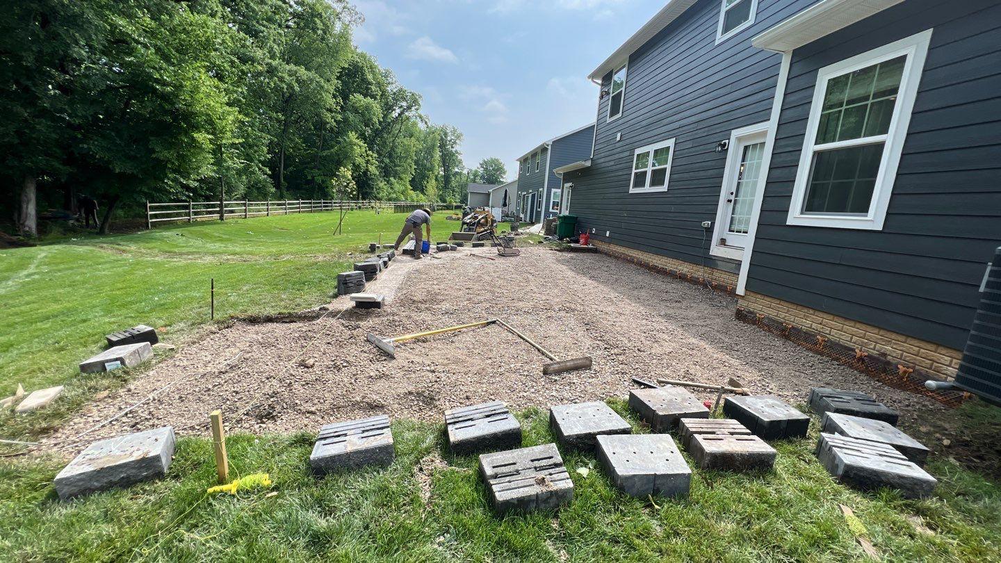 we began by clearing and grading the backyard (see the attached photos) so water would move away from the house. A compacted gravel base was installed to support the patio and help prevent settling or shifting over time, which is very important. After that, we set the pavers in a tight pattern with proper edge restraints. We also built matching seating walls and a grill surround to create a complete outdoor living area. The paver color blend was chosen to match the home’s siding and natural setting, so the patio looks like it always was there.